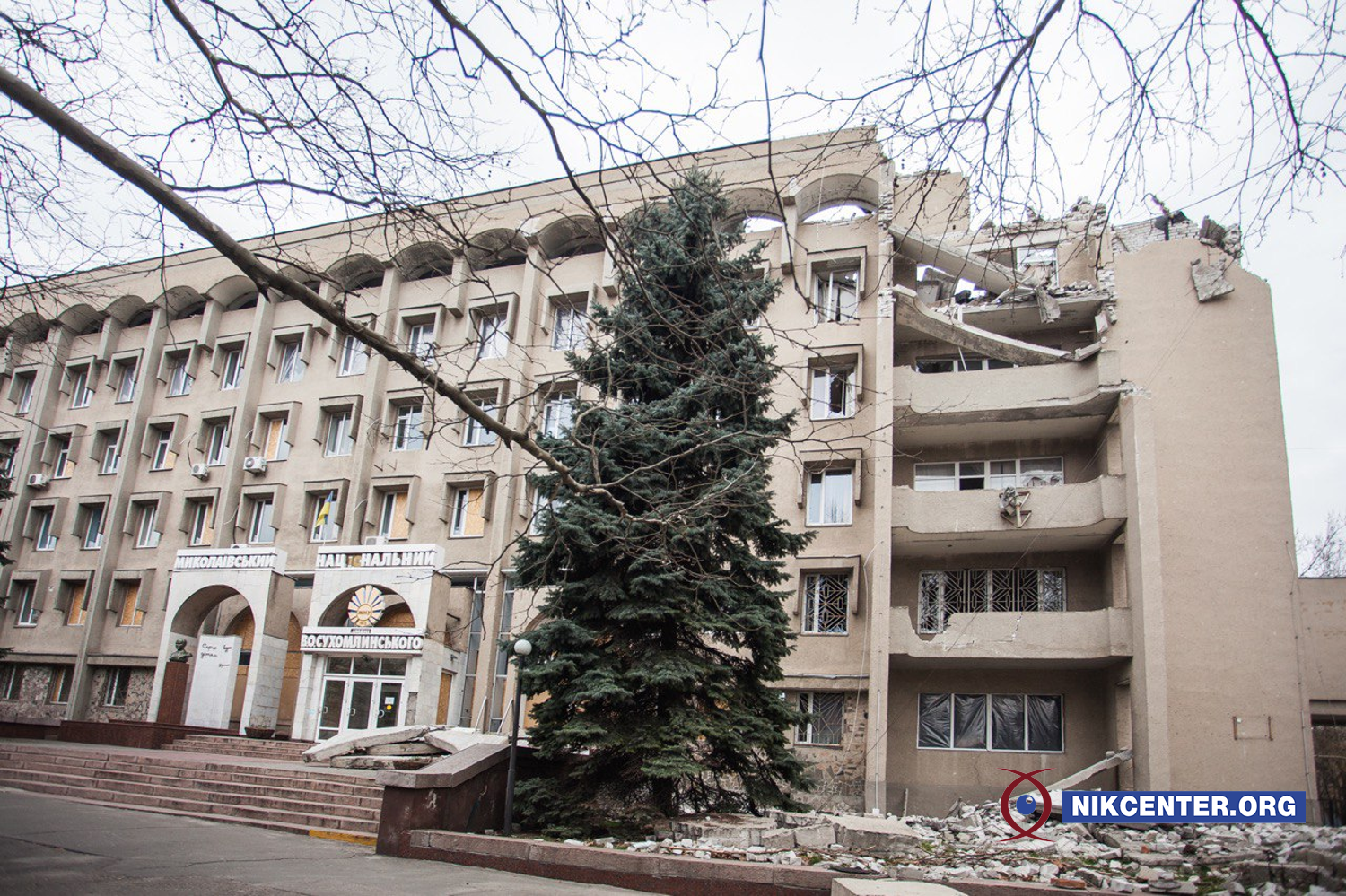Напередодні першого удару мер Миколаєва Олександр Сєнкевич показував навчальний заклад, аби продемонструвати, що там не розміщують військових і жодної техніки. Проте окупанти нанесли два удари ракетами С-300 по цивільному об’єкту. Вже за два дні виш знову потрапив під приціл ворога. Внаслідок вибуху, який стався біля парадного входу університету, зруйновано навіть підземну частину будівлі. Зараз територія навколо навчального закладу загороджена осб-плитами, щоб обмежити до неї доступ перехожих.