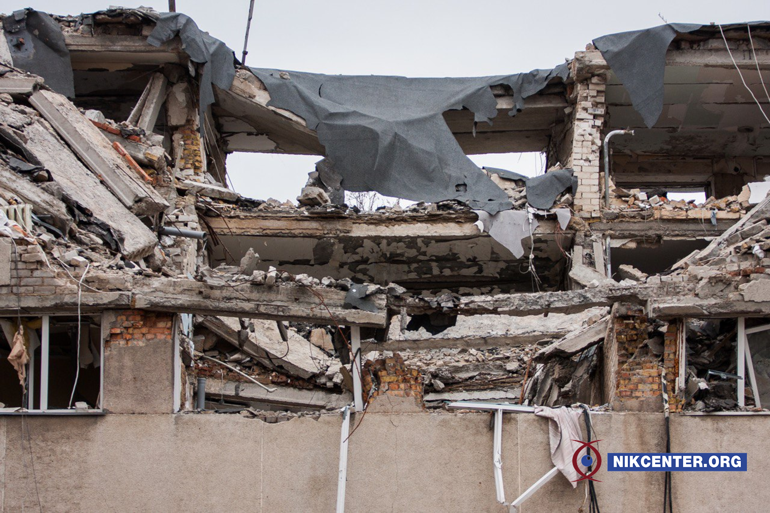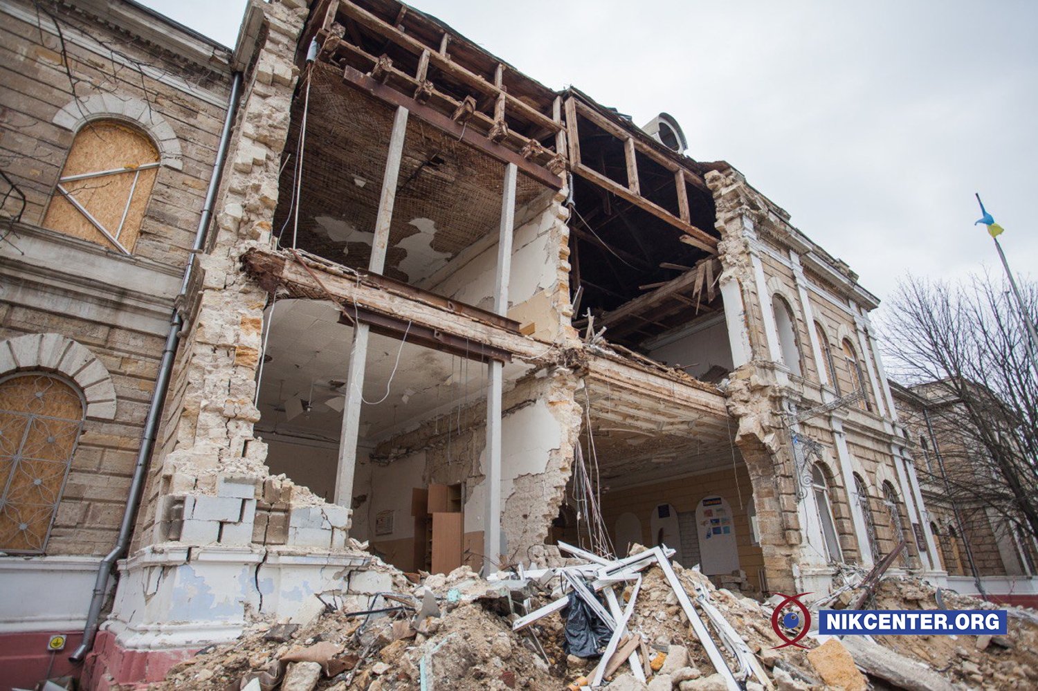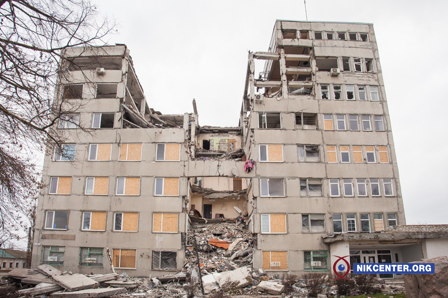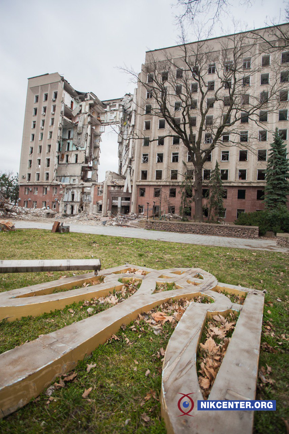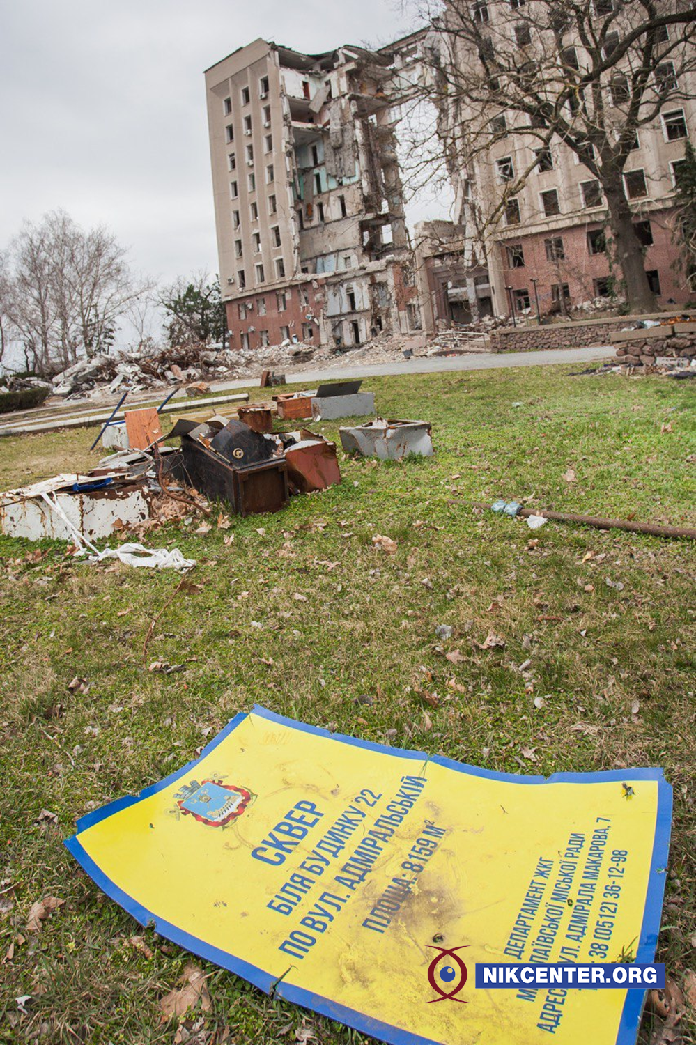 Будівля Миколаївської ОДА. Близько 8:45 29 березня 2022 року у неї поцілила російська крилата ракета, яка призвела до потужного вибуху, повністю зруйнувавши центральну секцію будівлі, від першого до дев’ятого поверхів.