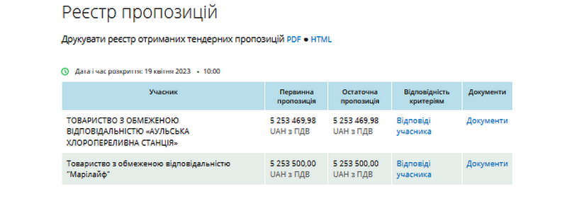 Однак в аукціоні взяли участь два найбільших постачальники рідкого хлору для водоканалів – ТОВ «Марілайф» та ТОВ «Аульська хлоропереливна станція». Обидва учасники, навіть за умов поставки по 4 тонни в машині, запропонували хлор на третину дешевше лютневої закупівлі.