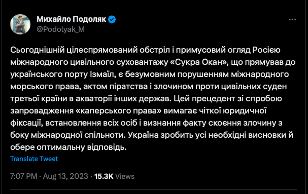 “Сьогоднішній цілеспрямований обстріл і примусовий огляд Росією міжнародного цивільного суховантажу “Сукра Окан”, що прямував до українського порту Ізмаїл, є безумовним порушенням міжнародного морського права, актом піратства і злочином проти цивільних суден третьої країни в акваторії інших держав”.