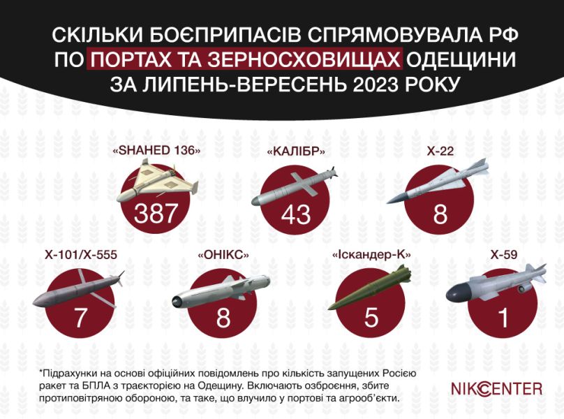 Після розриву зернової угоди, з 17 липня по 27 вересня 2023 року, Росія запускала для атак по портах та агропідприємствах Одеської області близько 400 дронів-камікадзе та 70 різних ракет. За два з половиною місяці росіяни атакували об’єкти регіону, пов’язані з зерном, протягом 20 ночей.