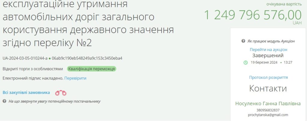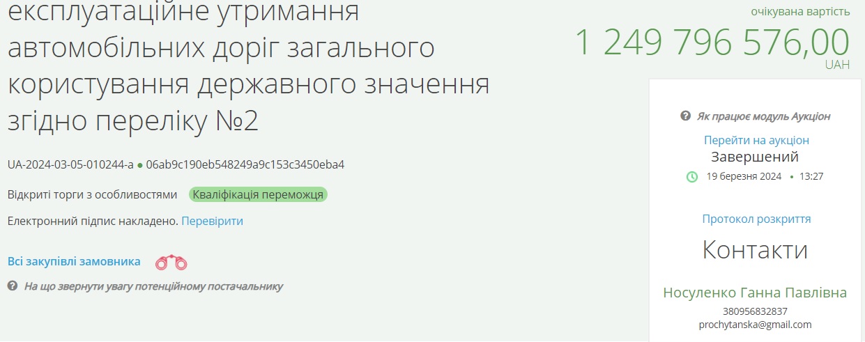 Обидві закупівлі провели у форматі відкритих торгів з особливостями. Переможцем одного з тендерів визначили компанію «Ростдорстрой», яка до 31 грудня 2026 року відповідатиме за експлуатаційне утримання доріг. За послуги товариство отримає з державного бюджету 1 мільярд 186 мільйонів 998 тисяч гривень.