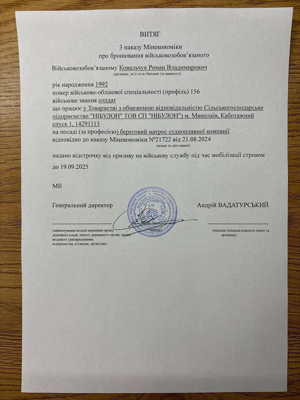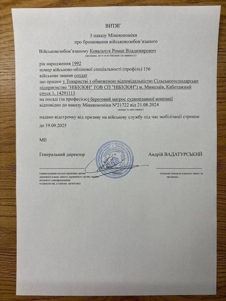 І найдешевший спосіб – оформлення бронювання нібито від відомого миколаївського підприємства «Нібулон». Чоловік навіть скинув приклад як виглядає такий документ.