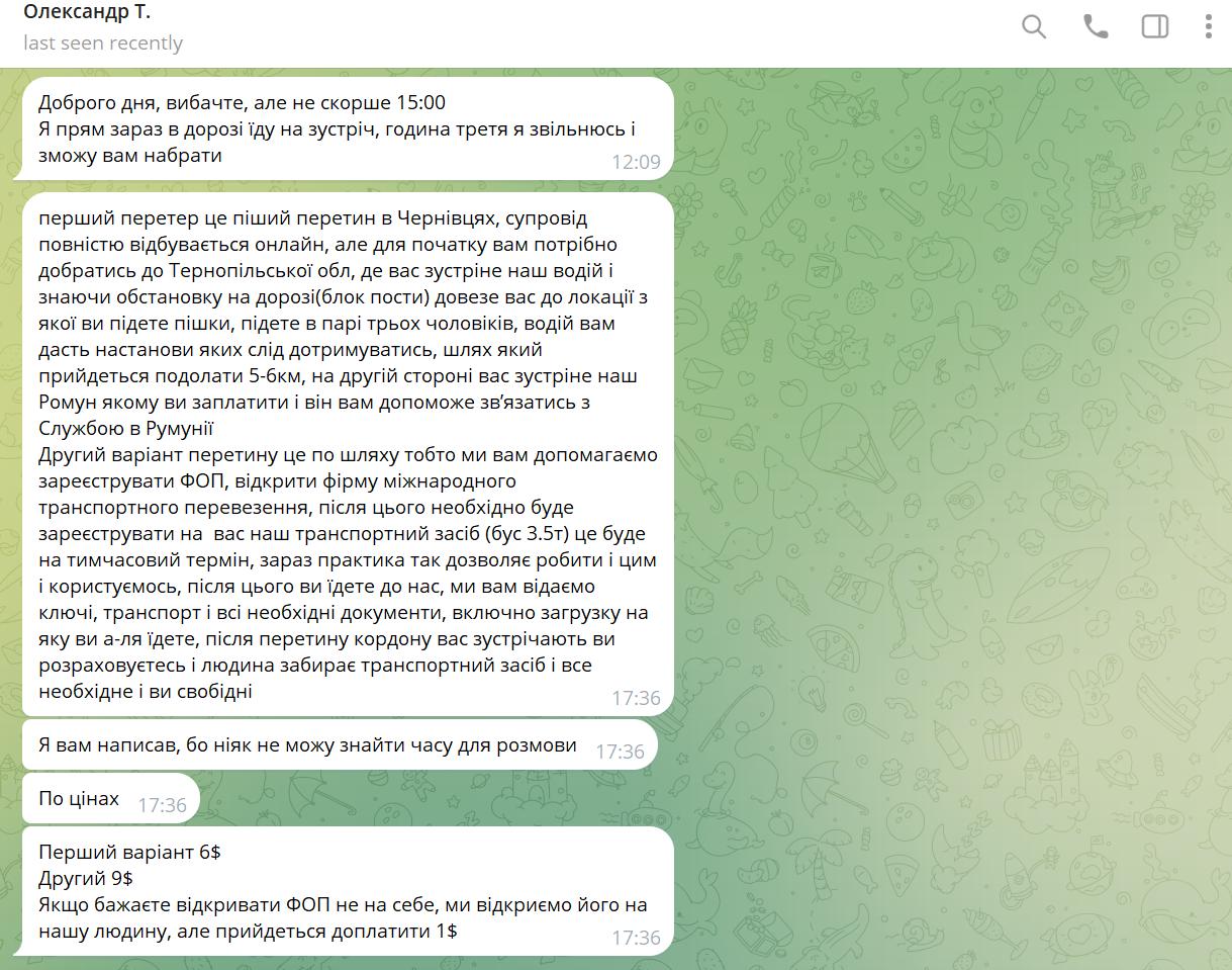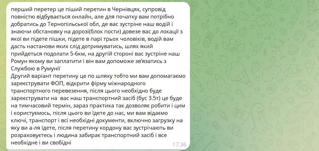 Наприклад, в Телеграм-каналі чоловік з ніком «Анатолій» створив групу з оголошеннями про організацію виїзду за кордон. В ній він розміщував навіть відгуки «задоволених клієнтів».