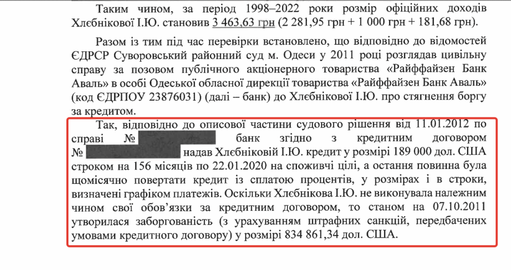 У результаті перевірки НАЗК встановило, що мати дружини декларанта за період з 1998 по 2022 роки отримала офіційні доходи у загальному розмірі 3 мільйони 463 тисячі гривень. Крім того, у 2011 році вона програла суд і мала сплатити понад 834 тисячі доларів боргу за споживчим кредитом. На майно жінки наклали арешт, однак в 2017 році виконавче провадження було закрите через відсутність майна.