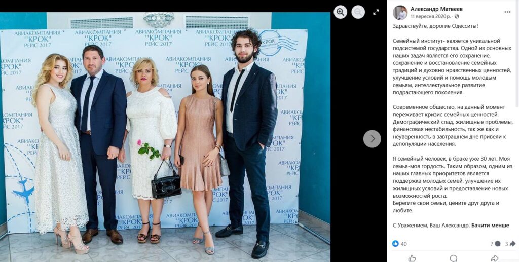 Олександра Матвєєва оголосили в розшук 12 червня 2024-го. А у квітні минулого року, коли розслідування щодо незаконного привласнення об’єктів нерухомості комунальної власності вже тривало, дружина Олександра Матвєєва подала до суду два позови – щодо розірвання шлюбу і щодо поділу майна. 2 серпня 2024 року Приморський районний суд Одеси шлюб розірвав. При цьому, схоже, це не перше розлучення подружжя Матвєєвих – у 2017 році вони вже розривали шлюб через суд. Тоді, як і зараз, в обґрунтуванні позовних вимог дружина одеського депутата зазначала, що спільний побут вони не ведуть.