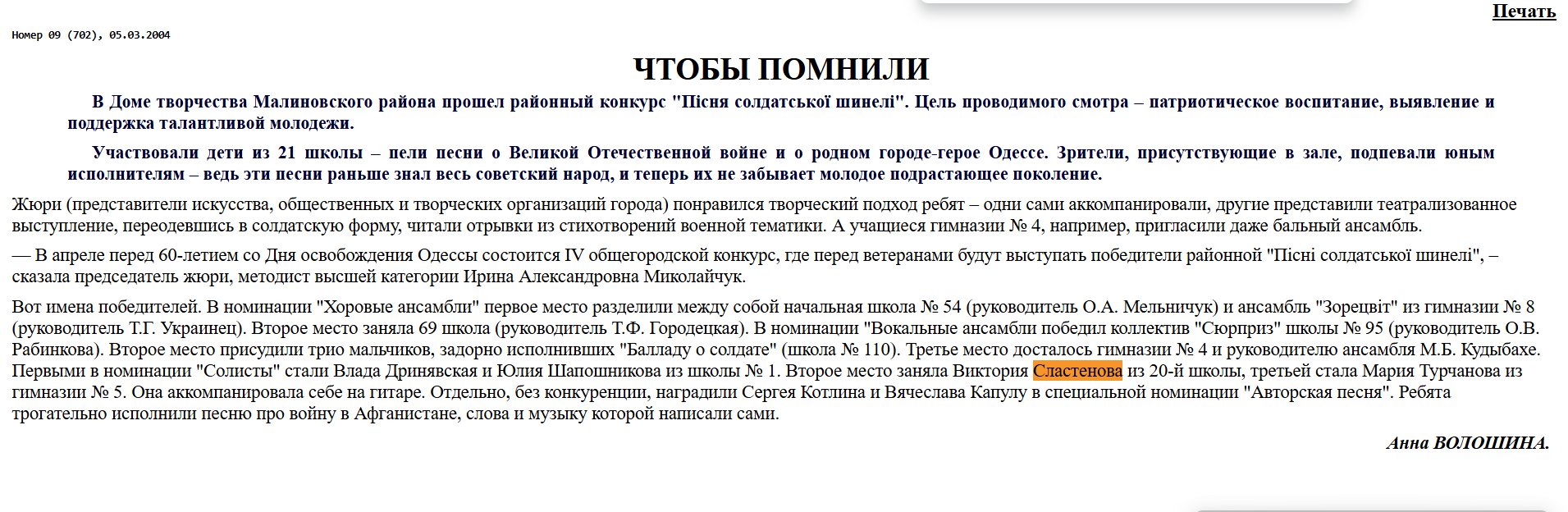 35-річна Вікторія Сластьонова-Марченко з Одеси раніше працювала вчителькою вокалу для дітей та мала власну студію. Музикою вона займалась ще зі школи – в 2004 році зайняла друге місце в конкурсі «Пісня солдатської шинелі».