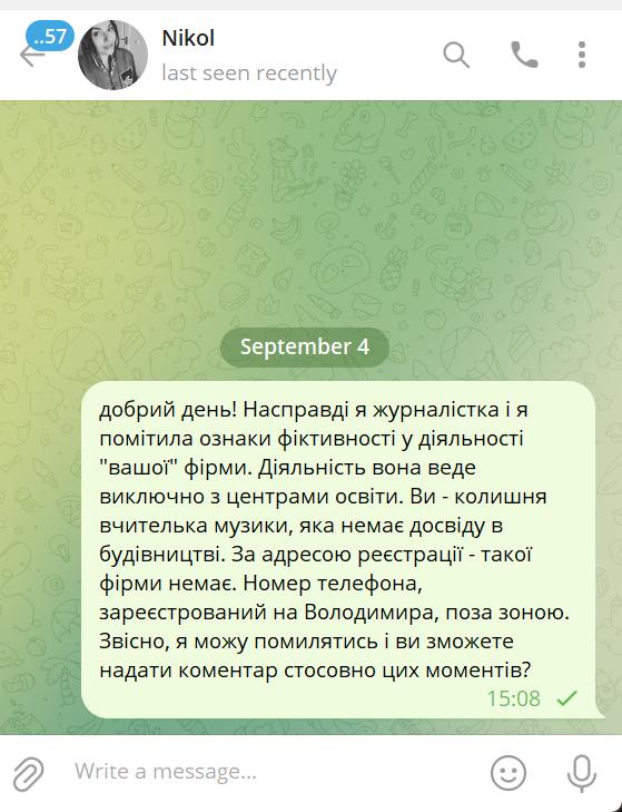Журналістка під виглядом представниці компанії, яка хоче залучити «Тріумфф-Буд» в якості виконавця капітального ремонту, написала власниці фірми Вікторії Сластьоновій-Марченко на особистий номер в Telegram та запитала прайс на послуги. В месенджері директорка компанії підписана як Ніколь – як пам’ятаємо, в анонсі вокального майстер-класу її представили саме як Вікторію-Ніколь. На те, що йдеться про одну й ту саму людину, вказують опубліковані фото та повідомлення в різних групах, які вище вже публікувались.