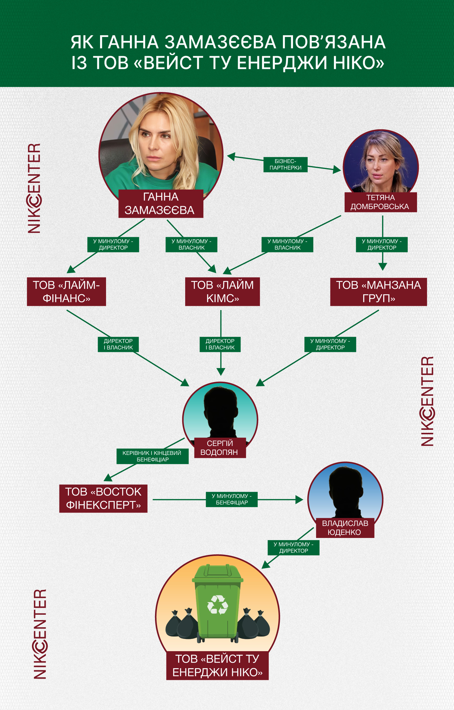 Втім, Nikcenter вдалося встановити опосередкований зв’язок між посадовицею і ТОВ «Вейст Ту Енерджи Ніко». Зокрема, із цією фірмою повʼязані постійні бізнес-партнери і керівники компаній Замазєєвої.