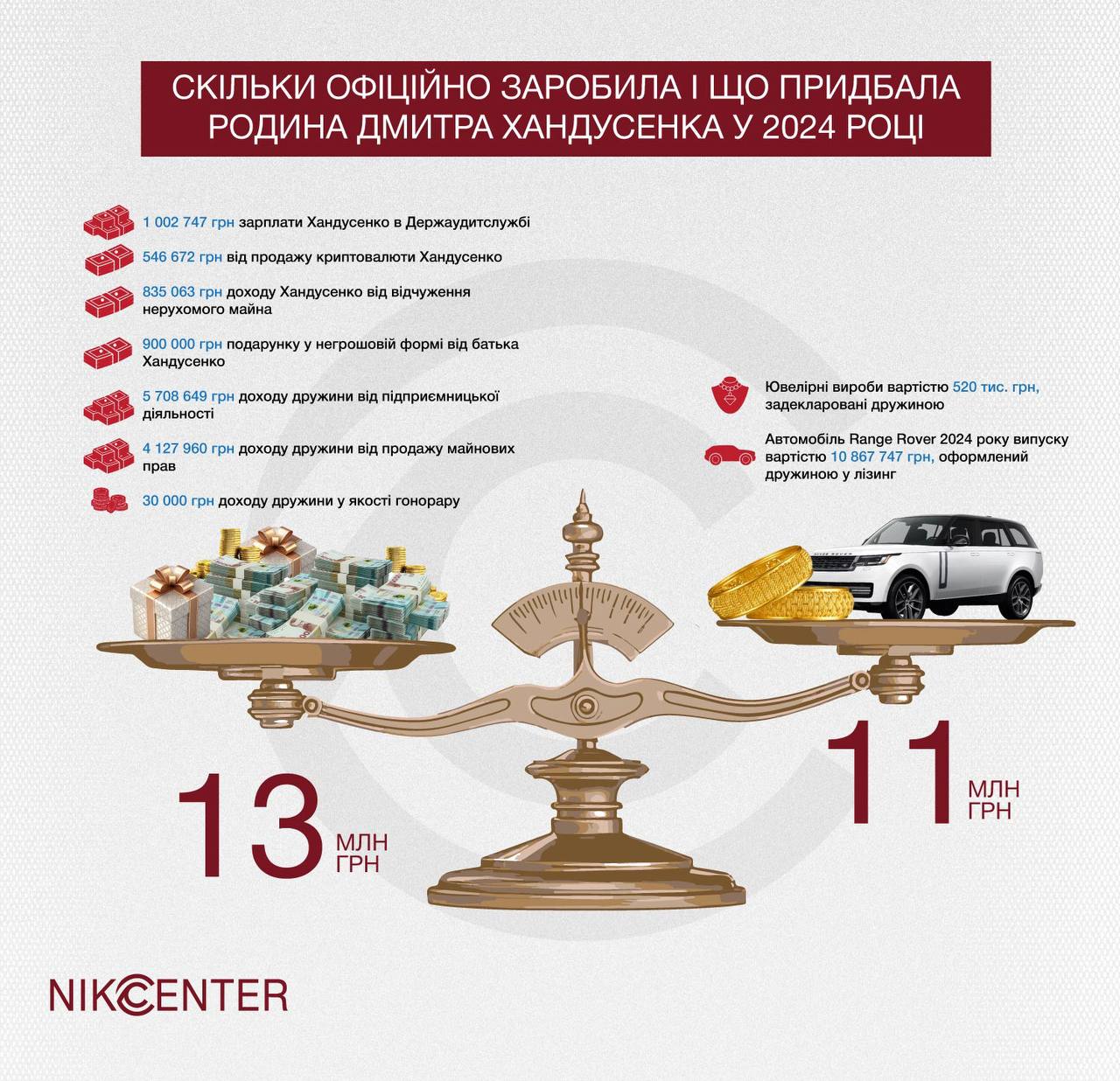 Згідно з декларацією за 2024 рік, як заступник начальника Південного офісу Держаудитслужби він отримав мільйон гривень, тобто більше 80 тис. грн на місяць. За ті декілька місяців, що він не працював на державу, Дмитро Хандусенко встиг зареєструвати дві компанії – ТОВ «ДіЕндж» і ТОВ «Діенж». Обидві, за КВЕДами, здійснюють роздрібну торгівлю через інтернет.
