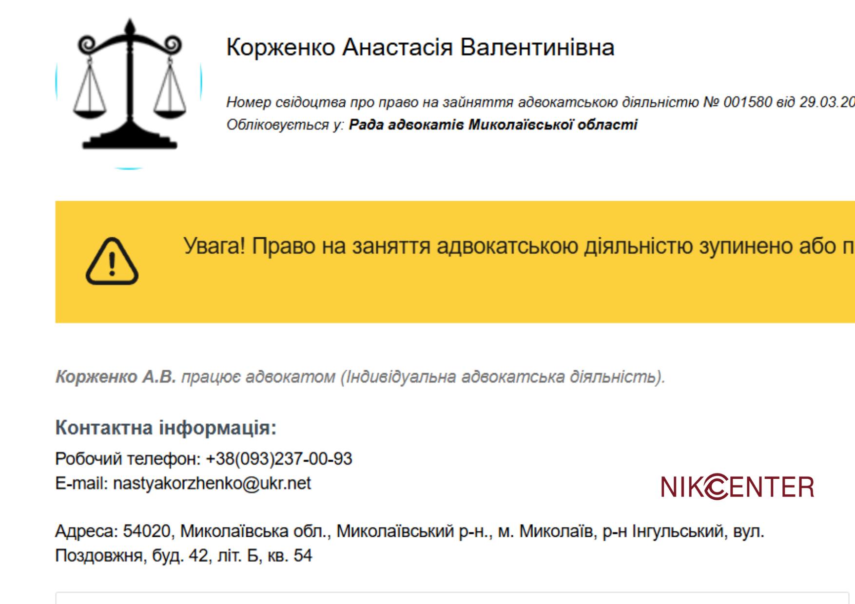 Контактною особою приватної компанії на аукціоні вказана її директорка та власниця – Стоєва. Однак контактний номер, схоже, належить начальниці відділу юридичного забезпечення адміністрації Інгульського району Анастасії Корженко. Цей номер вказаний в профайлі юристки на сайті «Адвокати України».
