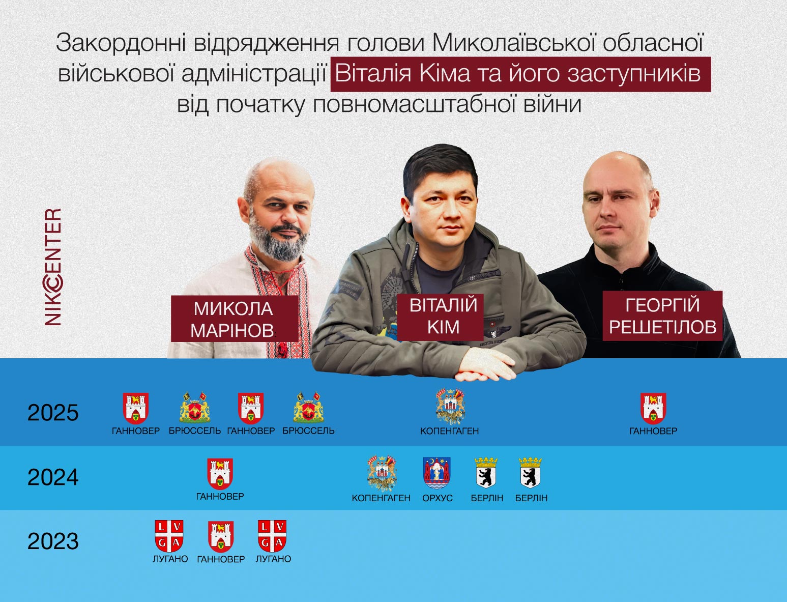Крім голови Миколаївської ОВА та його заступників, у відрядження за межі України їздили керівниця патронатної служби Віталія Кіма Олександра Кукуруза та двоє радниць – Вікторія Олійник і Неллі Яровенко.