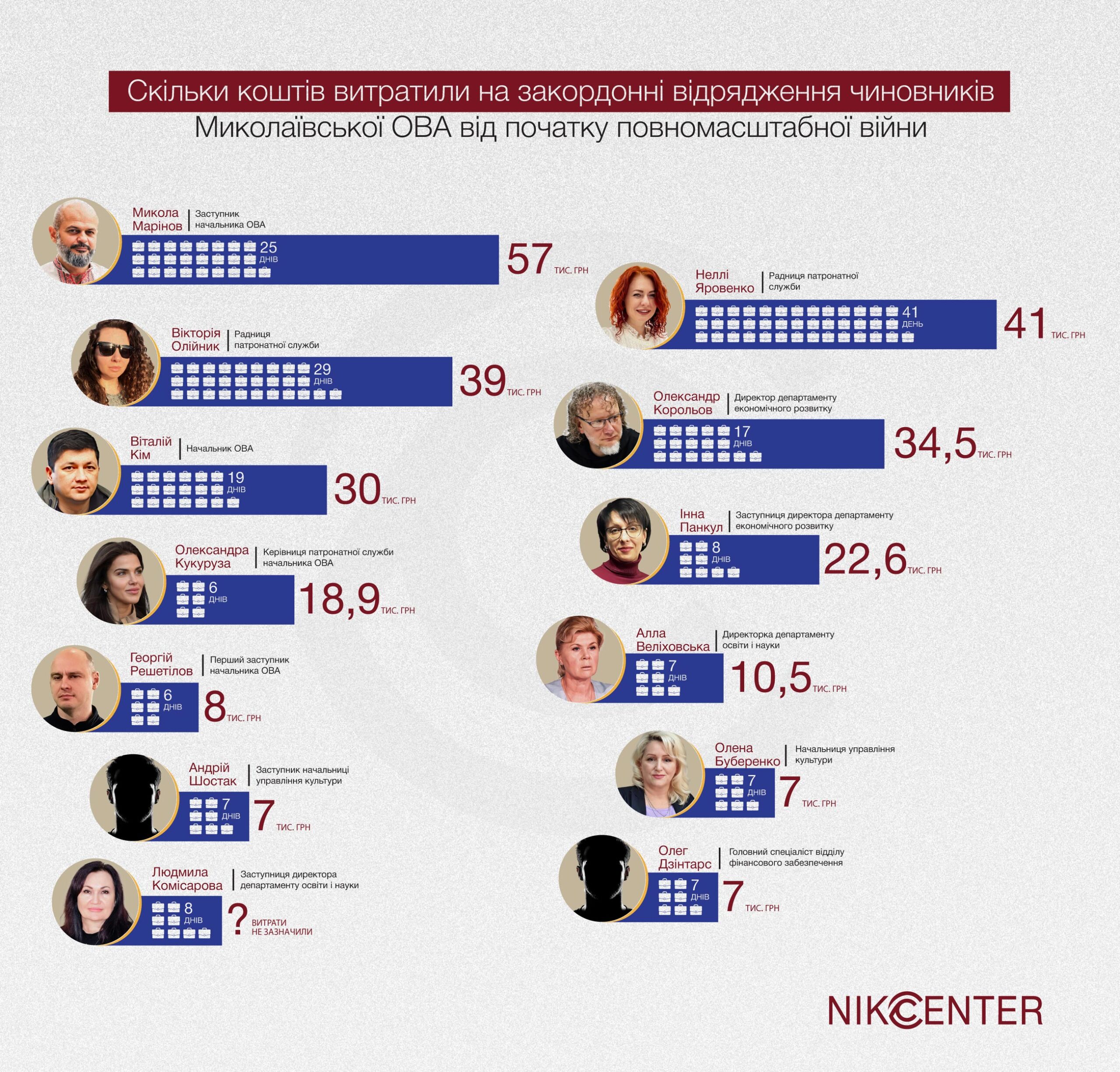 Крім голови Миколаївської ОВА та його заступників, у відрядження за межі України їздили керівниця патронатної служби Віталія Кіма Олександра Кукуруза та двоє радниць – Вікторія Олійник і Неллі Яровенко.