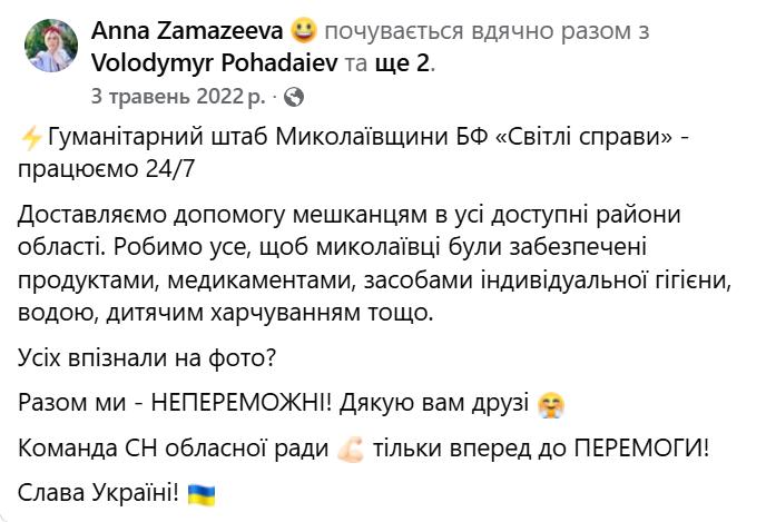 Наразі Замазєєва та Арахамія відсутні у переліку засновників фонду, а «прописка» юридичної особи змінилася з Миколаївської області на Закарпатську. Однак у дописах на офіційній сторінці БФ «Світлі справи» Ганну Замазєєву називають «наша амбасодорка». Також у соцмережах помітний зв’язок між БФ «Світлі справи», Ганною Замазєєвою та Володимиром Погадаєвим.