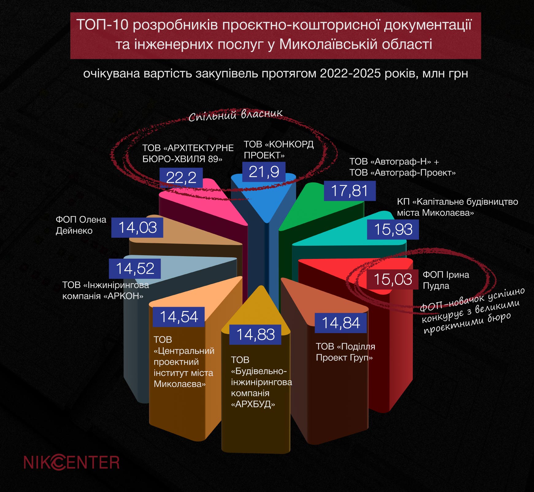 Особливістю ринку закупівель архітектурних та інженерних послуг є майже повна відсутність конкуренції. З-понад 8,5 тисяч закупівель останніх чотирьох років лише у 200 випадках на тендерах брали участь більше одного учасника. Тобто ознаки конкуренції наявні лише у 2,3% закупівель. Як наслідок, у Миколаївській області сформований пул підрядників розробки ПКД, які отримують контракти на мільйони гривень.