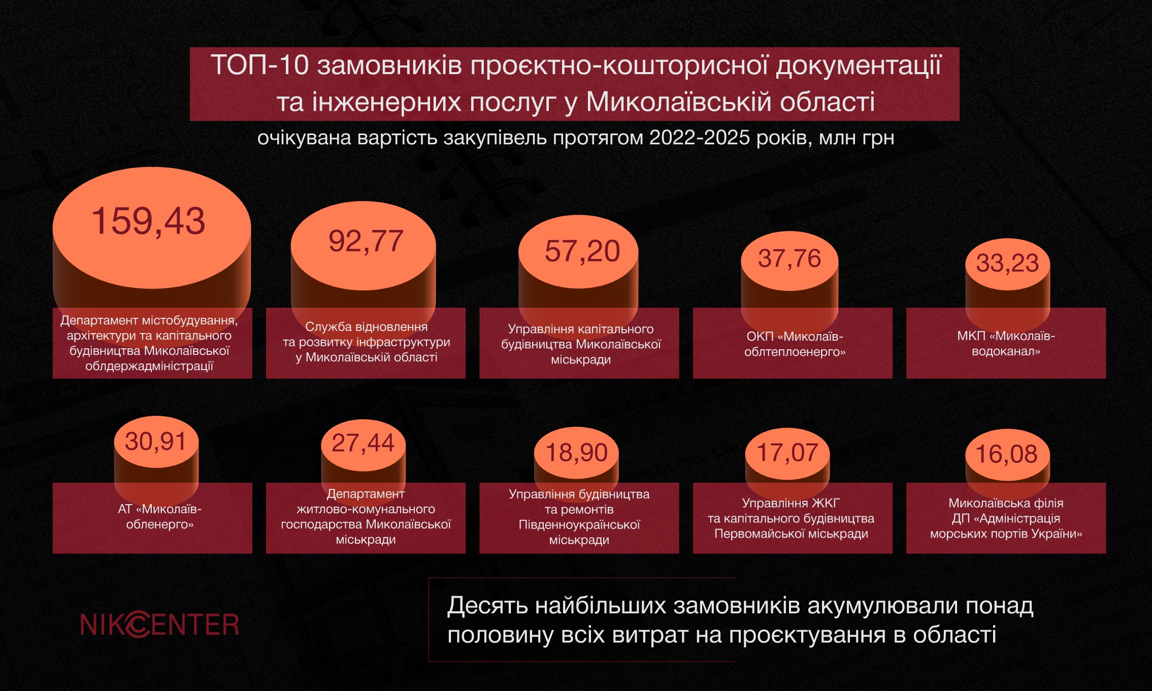 Найбільшим замовником очікувано став департамент містобудування, архітектури та капітального будівництва Миколаївської ОДА із загальною вартістю закупівель у 159 млн грн. Структурний підрозділ облдержадміністрації було обрано основним замовником проєктів з відбудови, що реалізуються державним коштом, тож перше місце виправдано.