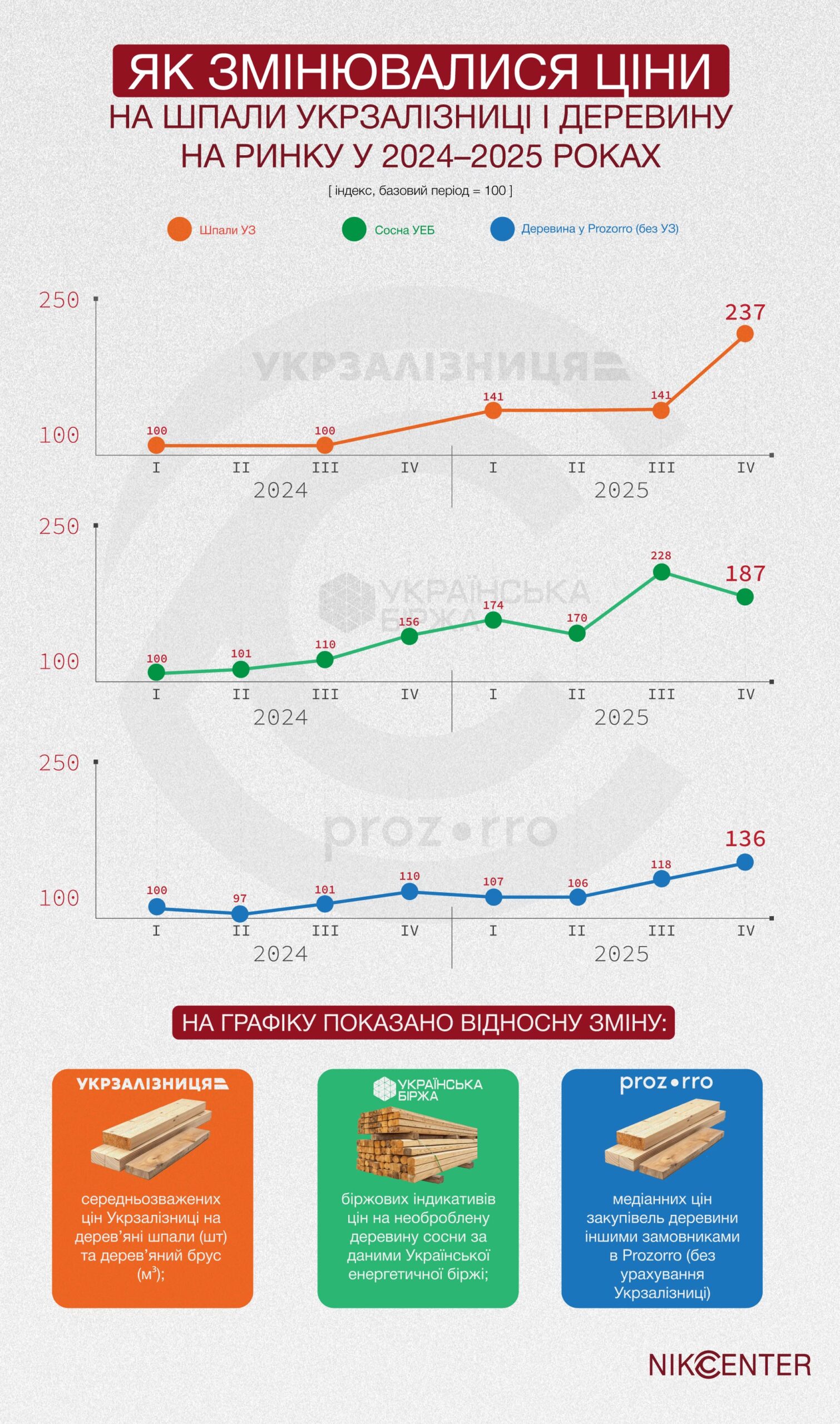 «Зростання цін на непросочені дерев’яні шпали та комплекти брусів у IV кварталі 2025 року було зумовлене передусім дефіцитом високоякісної сировини, необхідної для їх виробництва», – відповіли в держкомпанії на запит Nikcenter.
