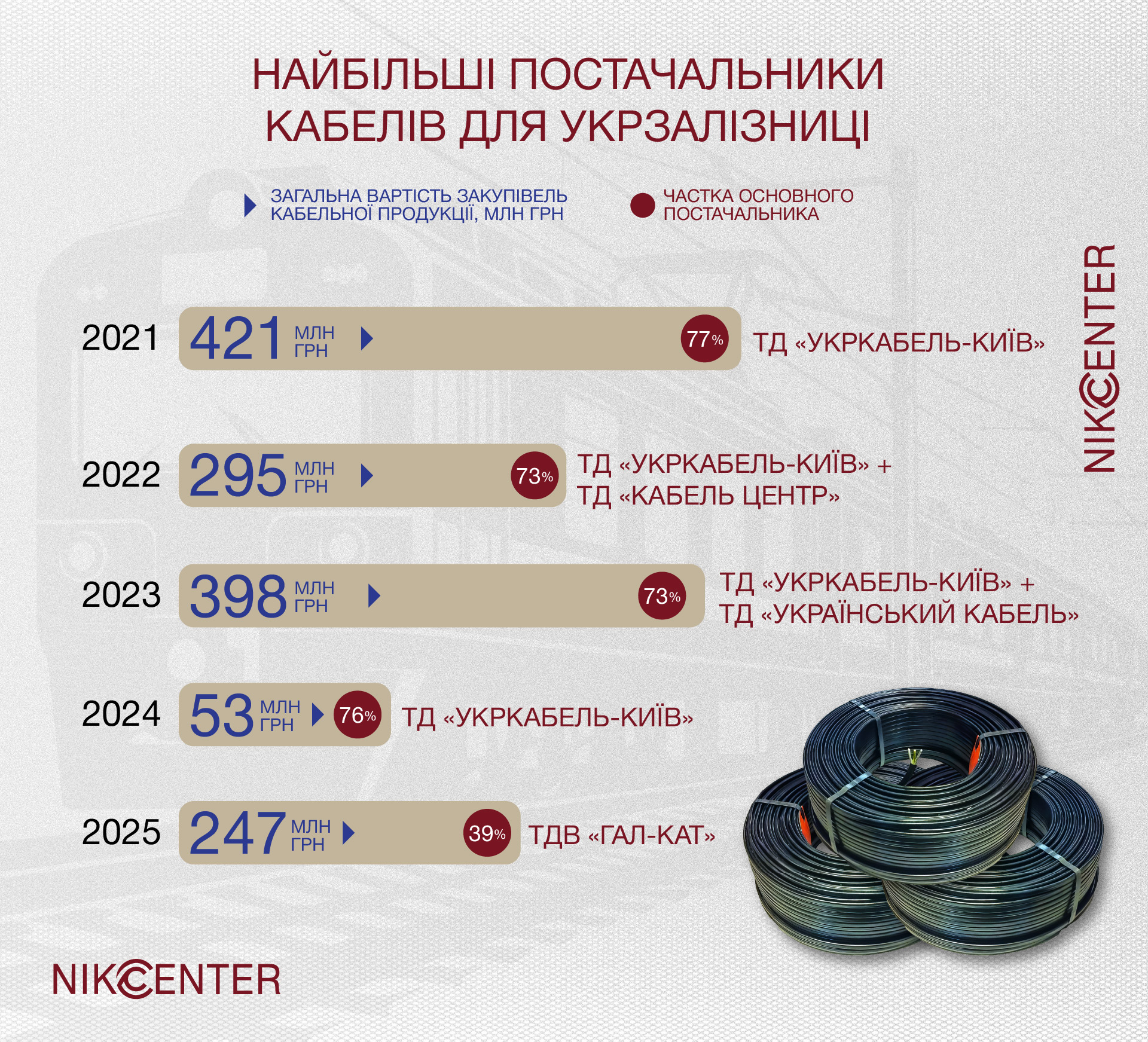 Щоб зʼясувати, яким був і як змінився ринок кабельно-провідникової продукції, Nikcenter проаналізував 129 закупівель кабелів та супутньої продукції, проведених філіями Укрзалізниці протягом 2021-2026 років. Загальна очікувана вартість таких закупівель склала 1,42 мільярда гривень.