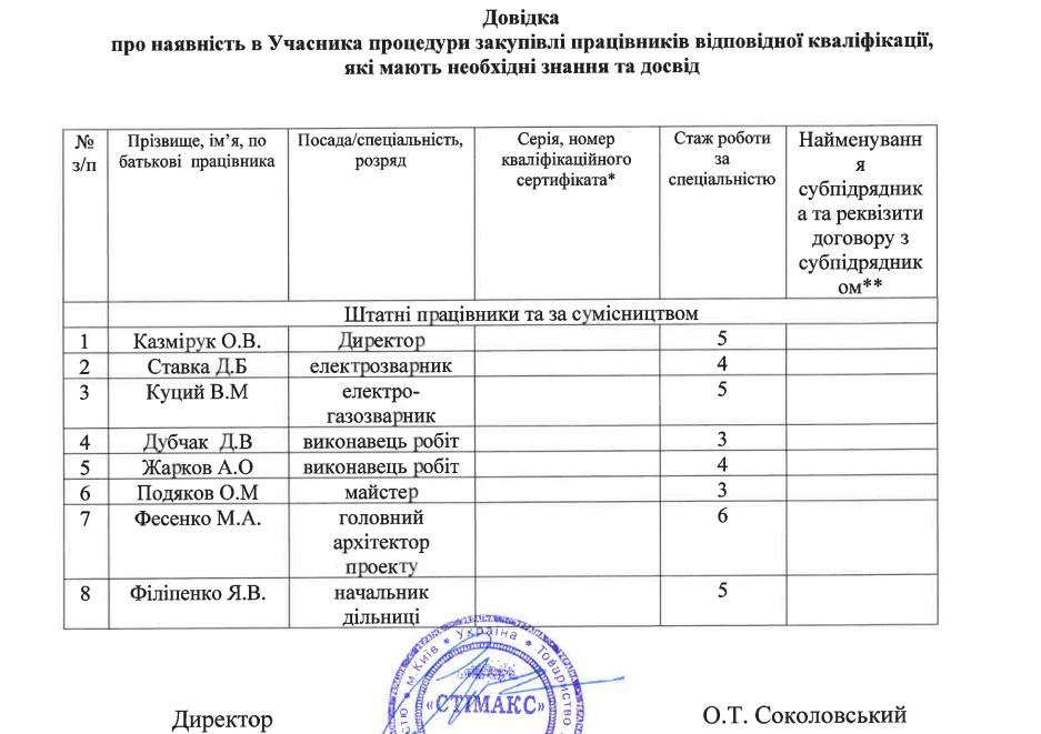 Втім, під час тендеру чиновників Одеської мерії не зупинила інформація про наявні кадри майбутнього підрядника, викладена у довідці. У ній зазначено, що компанія налічує вісім штатних працівників та робітників, що працюють за сумісництвом: від директора та головного архітектора до двох зварювальників та підсобного робітника.