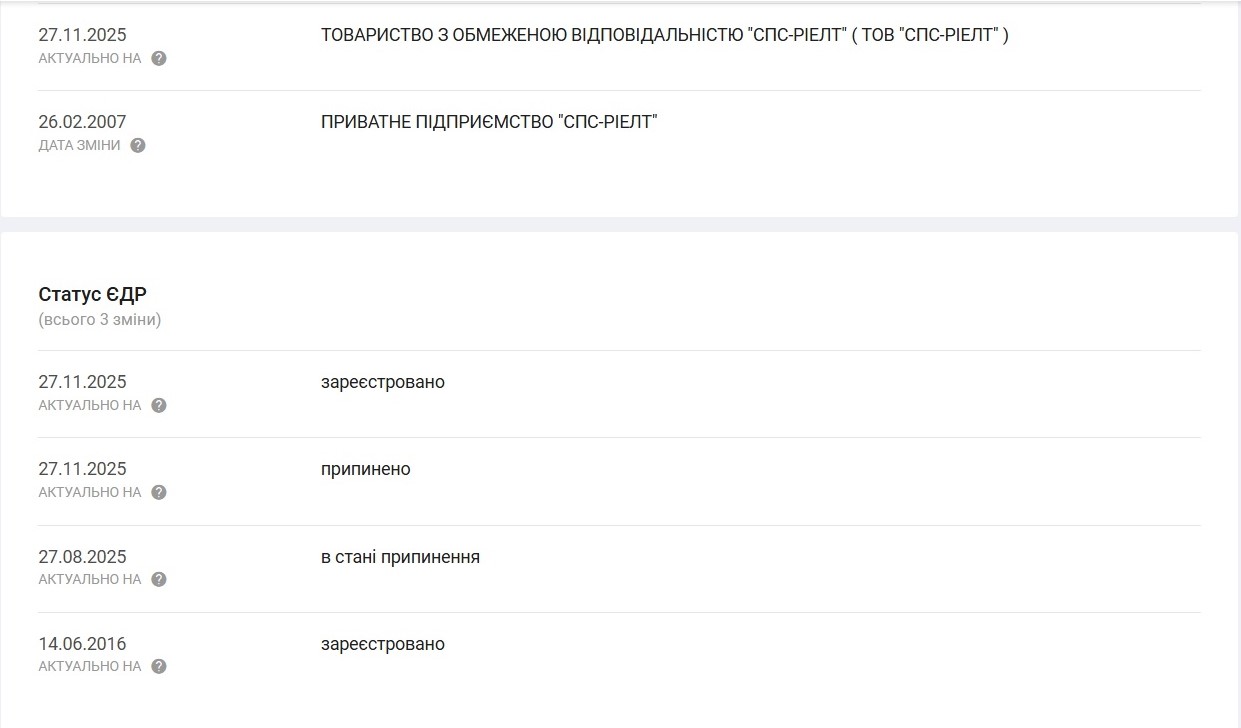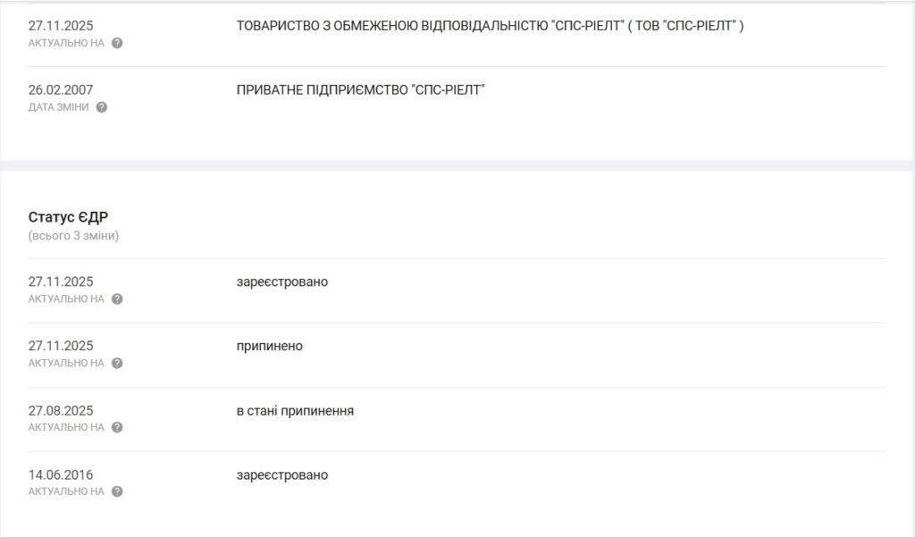 Примітно, що на той час компанія «СПС-Ріелт» уже змінила юридичну адресу та власників. Наразі серед бенефіціарів цього ТОВ чотири особи – Віталій Тамарцев, Едуард Кім, Павло Куліковський і Анастасія Жалковська. Тамарцев раніше був серед співвласників компанії «Ролада». Його бізнес-партнерами в цій компанії значились згадувана вище мати Василя Шкрябая Валентина Бойчук, сам Василь Шкрябай і мати іншого депутата від партії «Довіряй ділам» Андрія Кісловського Раїса.
