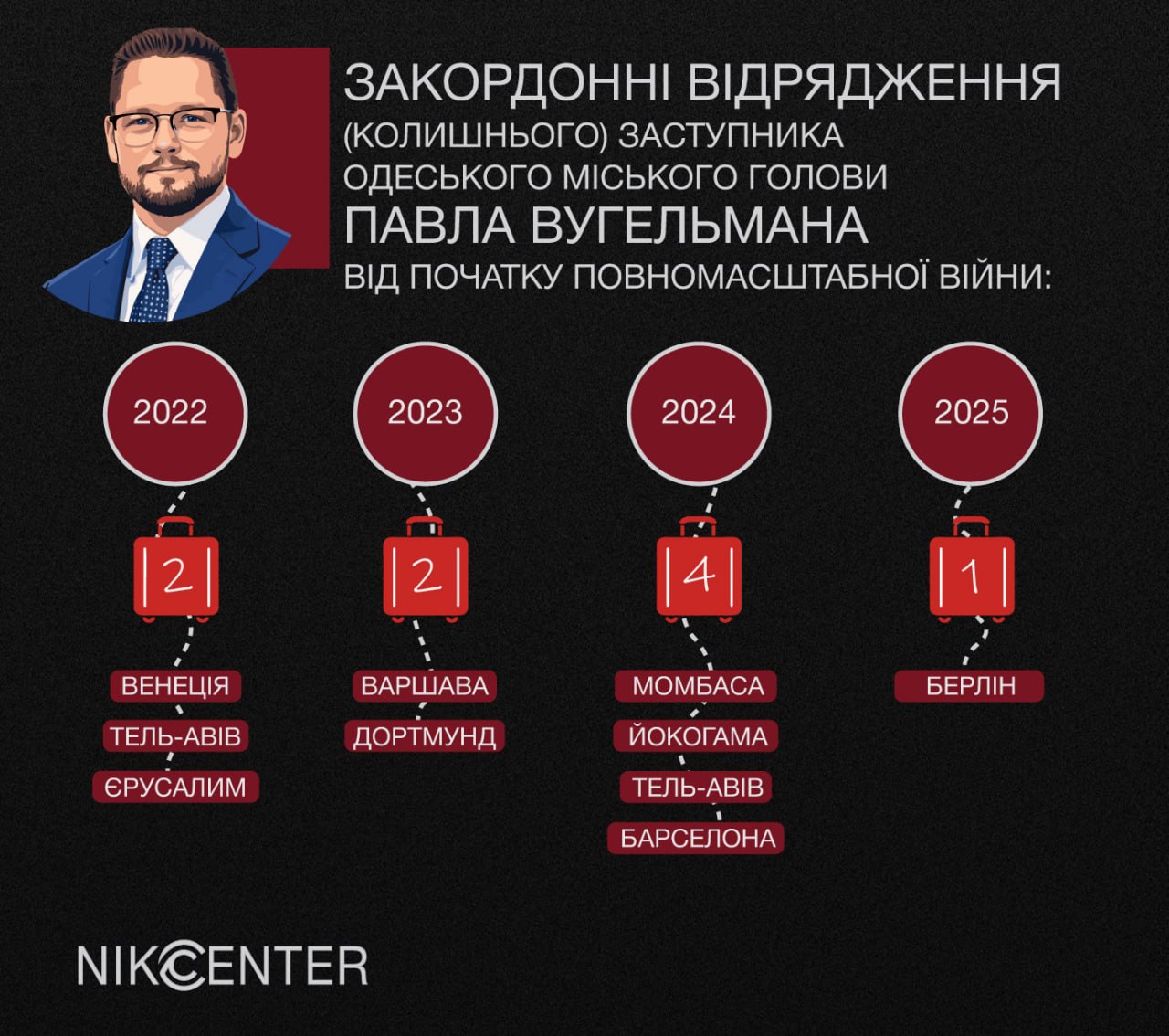 Загалом у 2022-2025 роках Павло Вугельман провів у закордонних відрядженнях більше 50 днів. Витрати з бюджету на ці поїздки не здійснювалися, однак у розрахункових листах заступника міського голови також передбачені виплати за час відряджень. Тільки за дев’ять місяців 2024 року Павлу Вугельману нарахували з бюджету 110 тисяч гривень за відрядження.
