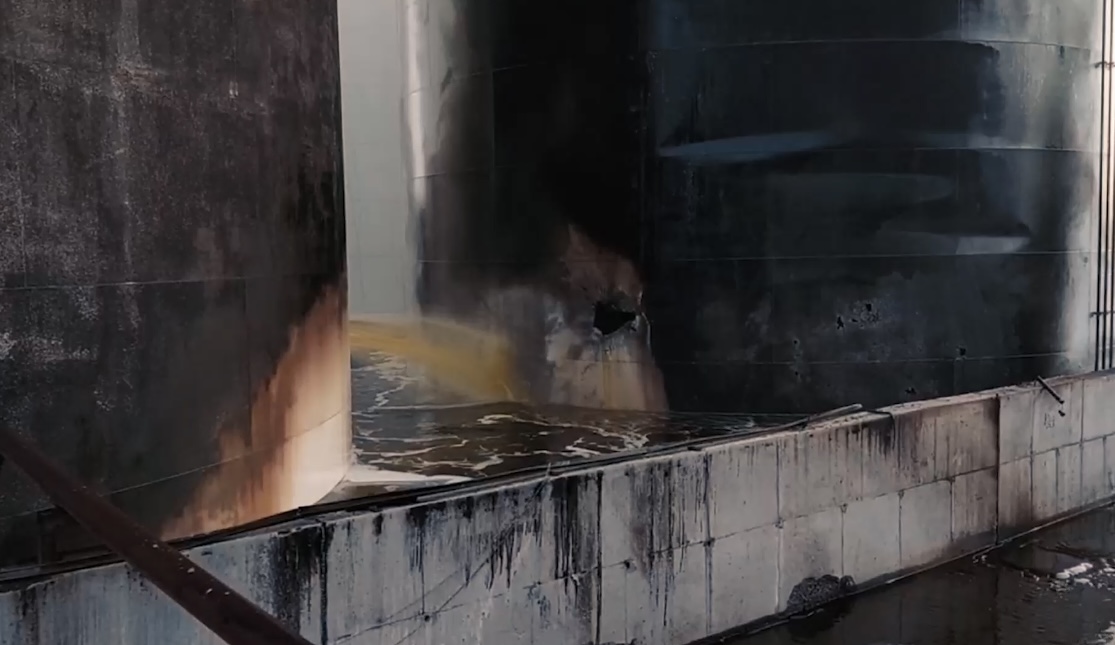 Наслідки російського удару по резервуарах з соняшниковою олією у терміналі «Евері» в Миколаєві. Фото: nikcenter.org