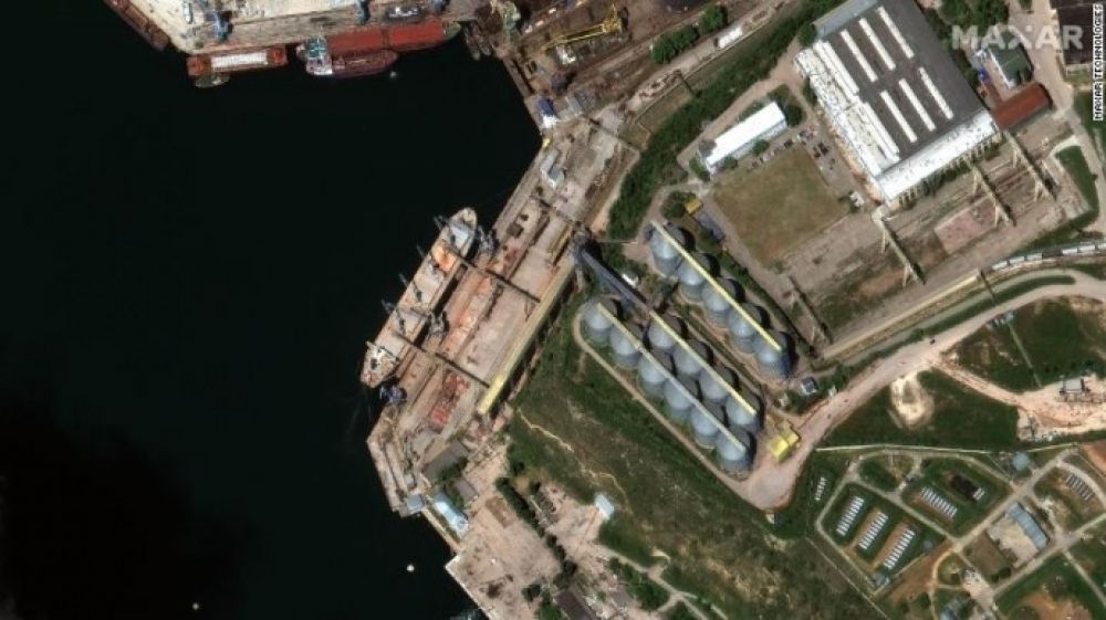 Спутниковый снимок от Maxar Technology показывает, как зерно загружается в корпус корабля под российским флагом "Матрос Позинич" в оккупированном Крыму, 19 мая. MAXAR TECHNOLOGIES