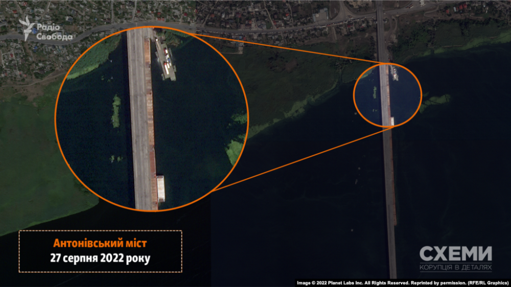 27 серпня супутник Planet Labs зафіксував процес будівництва окупантами понтонної переправи поблизу пошкодженого Антонівського моста: довжина зведеного мосту сягає понад 620 метрів.