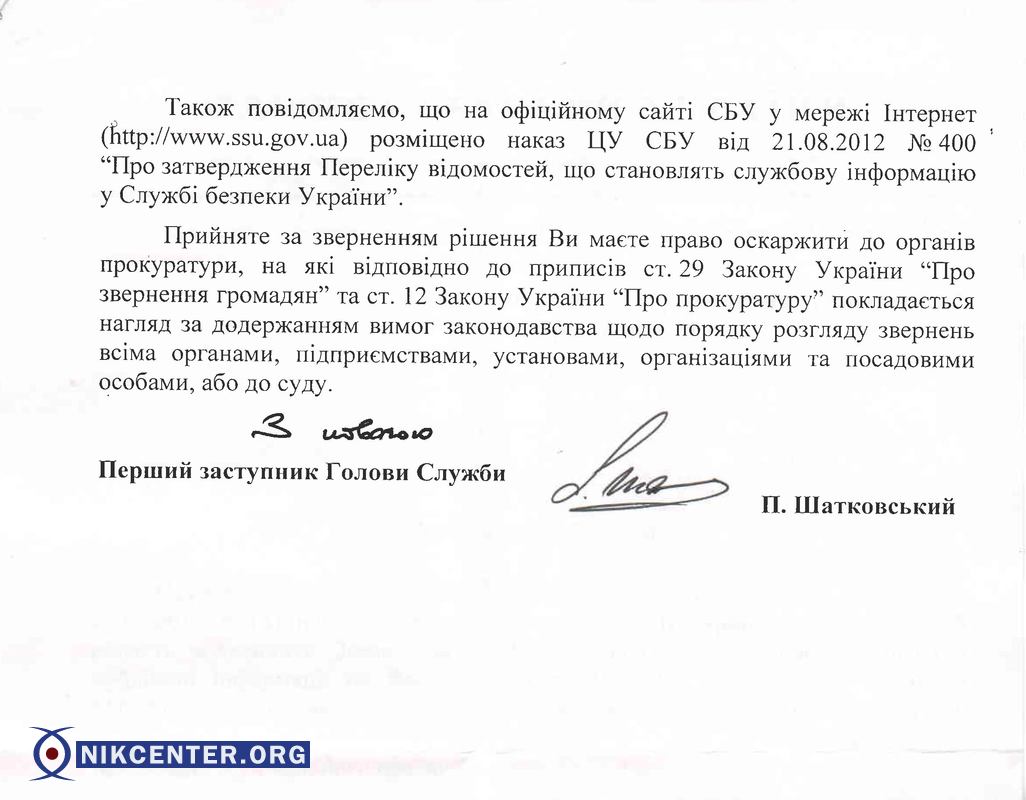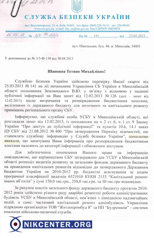 Через полтора месяца первый зам главы СБУ Петр Шатковский ответил, что местные СБУушники засекретили несекретную информацию… по ошибке. «Информируем, что служебные лица УСБУ в Николаевской области, которые рассматривали запрос от 12.02.2013, с ссылкой на ч. 2 ст. 6, ч. 1 ст. 9 Закона Украины "О доступе к публичной информации" и пунктов 10.6, 14.1 приказ УУ СБУ от 21.08.2012 № 400 "Об утверждении Перечня сведений, составляющих служебную информацию в Службе безопасности Украины", ошибочно полагали, что запрашиваемая Вами информация о распоряжении бюджетными средствами относится к категории информации с ограниченным доступом», — говорится в письме генерал-полковника СБУ. Также Петр Шатковский предоставил все интересовавшие Центр суммы расходов текущих и капитальных ремонтов, проведенных николаевским СБУ в 201-2012 гг. Но будут ли наказаны чересчур ретивые работники СБУ, незаконно засекретившие публичную информацию, в письме, к сожалению, не сообщается.