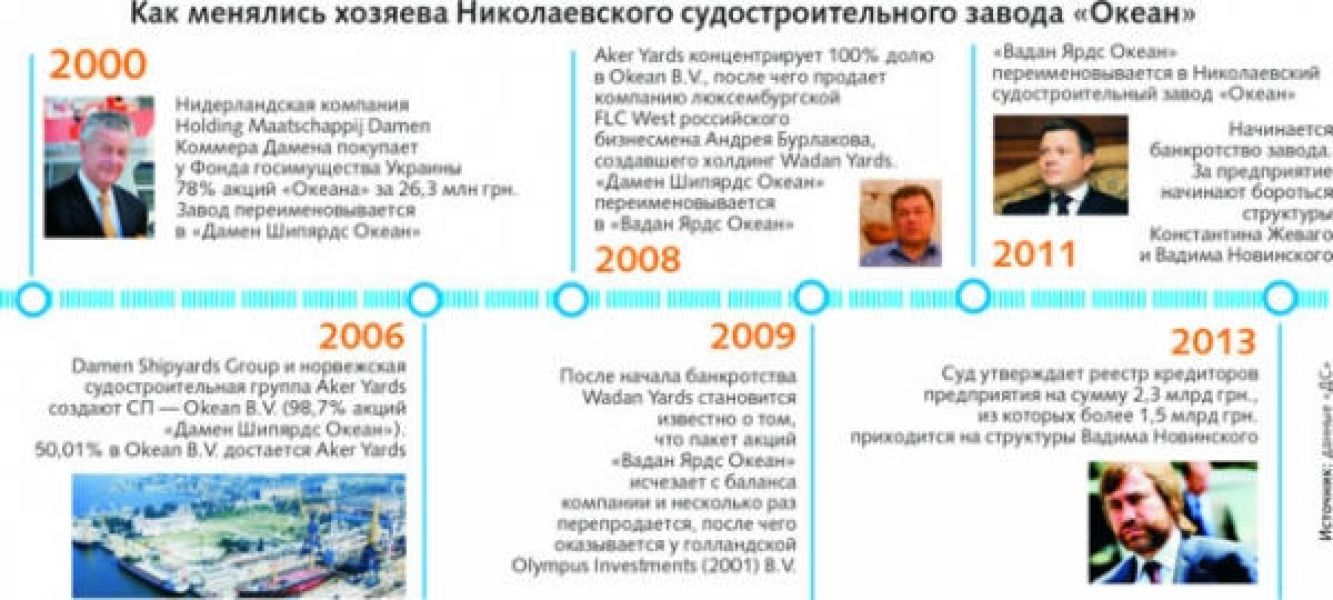 «В сложившейся ситуации контроль над процессом банкротства николаевского завода всецело перешел к Вадиму Новинскому. И теперь он имеет возможность завершить интеграцию проблемного предприятия, которое пока работает в минус (в 2012 г. при доходе 78 млн грн. убытки «Океана» приблизились к 160 миллионам гривен) в свой судостроительный холдинг Smart Maritime», — делает вывод издание.
