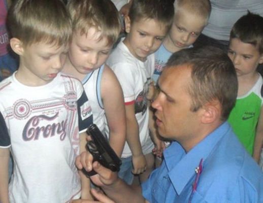 Во время экскурсии в Южноукраинский ГО УМВД Украины в Николаевской области, заместитель начальника указанного райотдела майор милиции Александр Лопушенко направил дуло боевого пистолета прямо в лицо малолетнему воспитаннику местного детского сада.