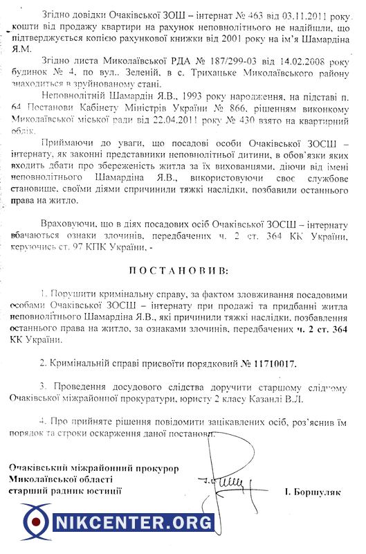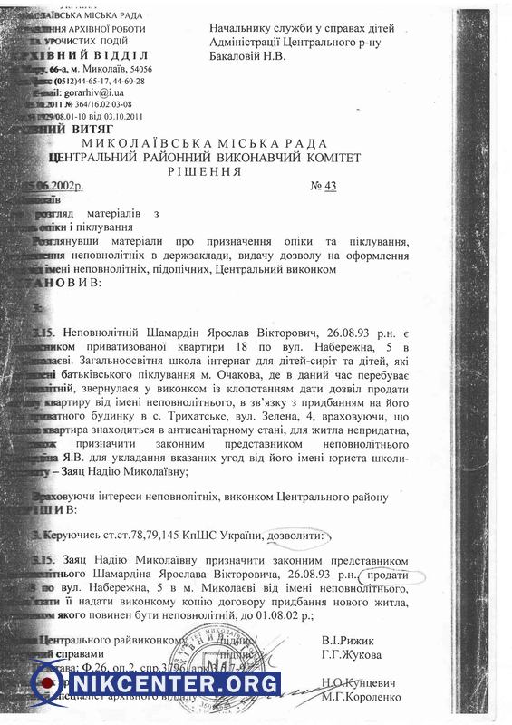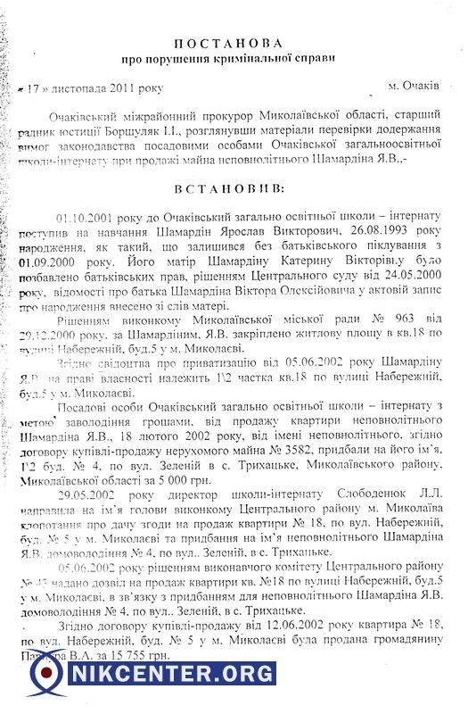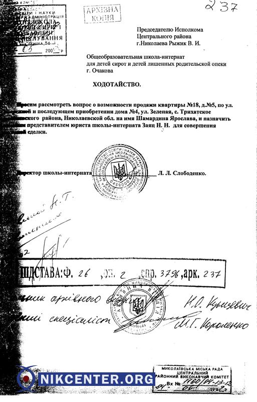 Уже в феврале 2002 года юрист Очаковского интерната Надежда Николаевна Заяц (позднее она сменила фамилию на Рура), выполняя распоряжение директора интерната Людмилы Леонидовны Слободенко, якобы «в интересах» воспитанника интерната Ярослава Шамардина, купила за 5 тысяч гривен несовершеннолетнему ребенку (!) глинобитную «хатынку» в селе Трихатском, в самой глуши и бездорожье. А в июне того же года «продала» элитную квартиру в Николаеве, принадлежащую Ярославу, некому гражданину В.А. Парпуре. По утверждениям чиновниц, это был «равноценный обмен».