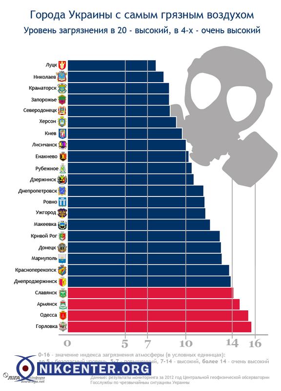 С большим уровнем загрязнения воздуха такие города как Днепропетровск, Киев, Енакиево, Херсон, Запорожье, Николаев и другие.