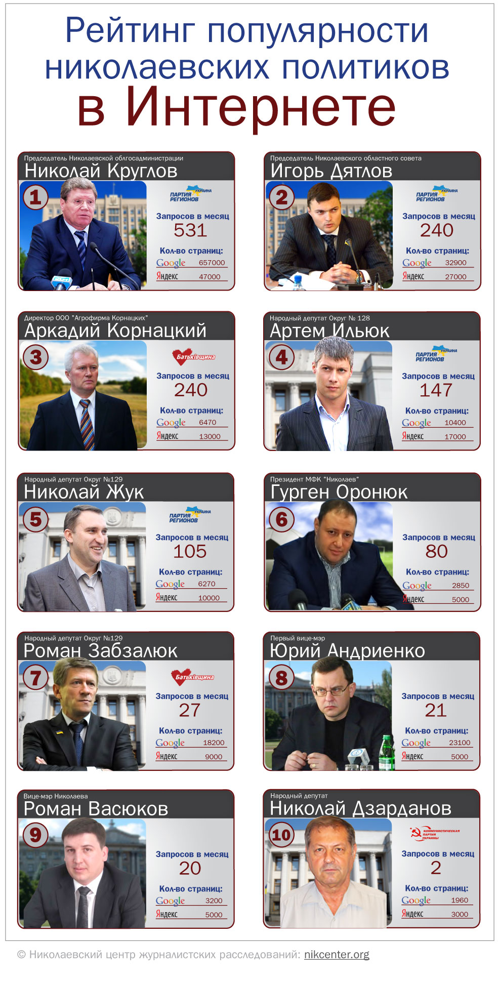 По итогам рейтинга десятка наиболее раскрученных в Интернете николаевских политиков выглядит так: