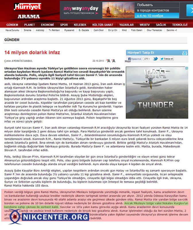 — «Хюрритет» пишет о подробностях убийства Рамзи Матты в Стамбуле. Николаевский бизнесмен египетского происхождения кинул своего сирийского партнера Самира Фоза. Сириец перечислил 14 миллионов долларов за поставку двух сухогрузов с зерном, но ничего не получил и поручил своему иранскому партнеру разобраться с Маттой. А этому Рамзи раньше все сходило с рук. Он не раз был замешан в махинациях с банковскими кредитами, участвовал в рейдерских захватах гос собственности, его однажды задержали за дачу взятки 10 тысяч долларов, но у Матты хорошая крыша — губернатор Николаевской области Николай Круглов", — пишет журналист.