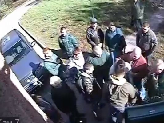 На видео видна драка и можно заметить, как руководитель николаевской городской организации ВО «Свобода» Игорь Деревянко (в песочной курточке, с коричневым капюшоном — ПН) бьет ногами менеджера магазина «Охота».