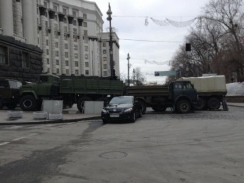 Подъезд к зданию Кабмина заблокировали около трех десятков грузовиков и автобусов с номерами внутренних войск. Во внешнем дворе здания правительства стоят несколько автобусов с правоохранителями.