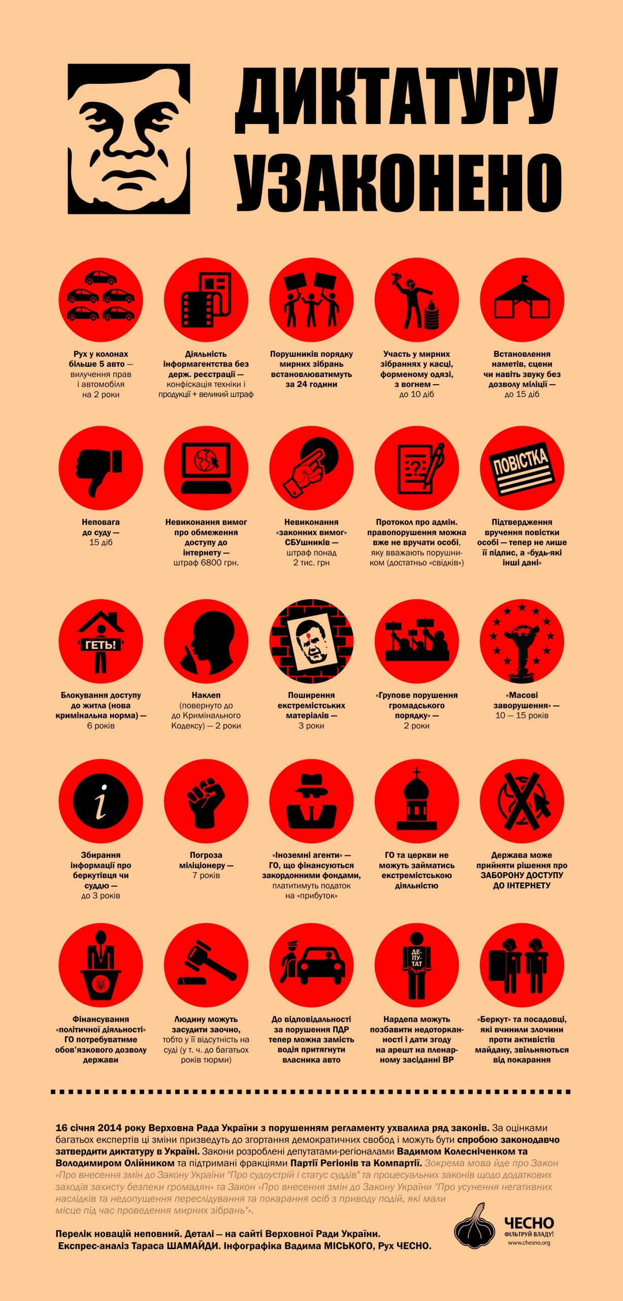 16 січня 2014 року Верховна Рада України з порушенням регламенту ухвалила ряд законів. За оцінками багатьох експертів ці зміни призведуть до згортання демократичних свобод і можуть бути спробою законодавчо затвердити диктатуру в Україні. Закони розроблені депутатами-регіоналами Вадимом Колесніченком та Володимиром Олійником та підтримані фракціями Партії Регіонів та Компартії.