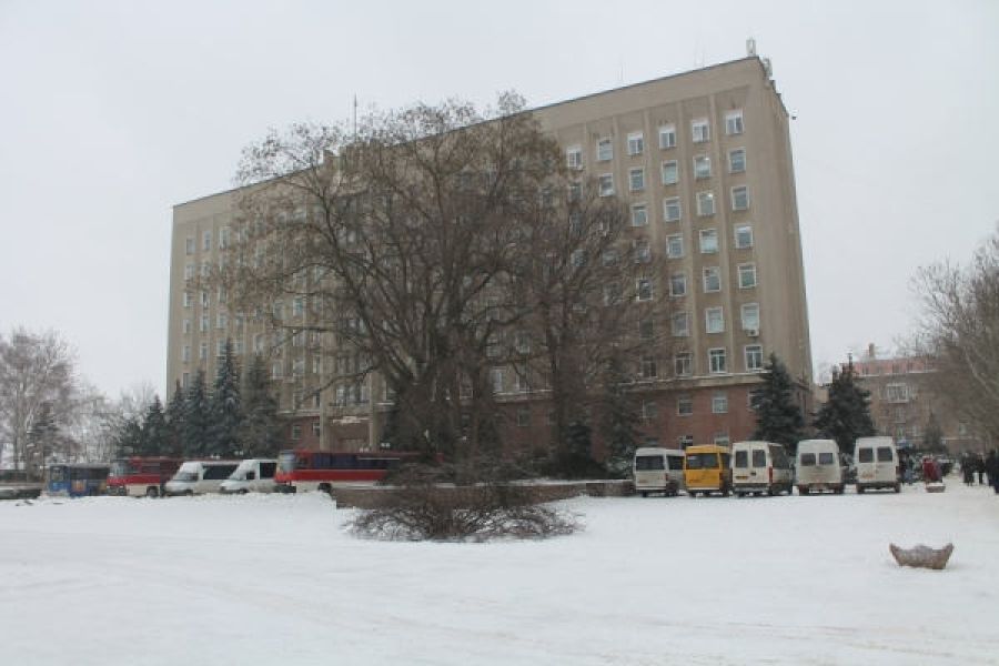Сегодня утром ко входу в Николаевскую ОГА пригнали десять автобусов: три крупногабаритных «Икаруса» и семь микроавтобусов «Спринтер» и «Мерседес».