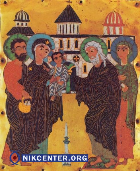 Богоприимец Симеон взял Богомладенца на руки, и, благословив Его, пророчествовал о Спасителе: «Ныне отпущаеши раба Твоего, Владыко, по глаголу Твоему с миром: яко видеста очи мои спасение Твое, еже еси уготовал пред лицем всех людей: свет во откровение языком, и славу людей Твоих Израиля».