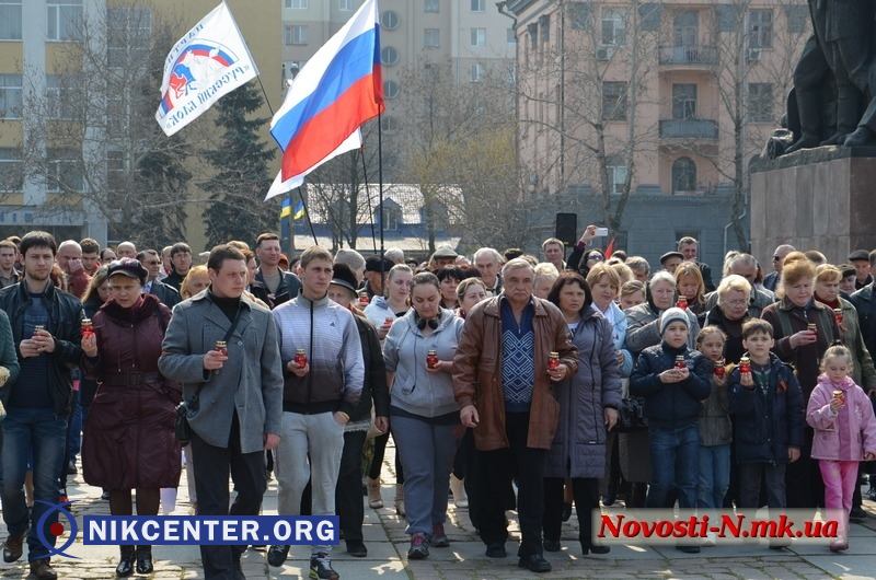 На фоне развернутого флага участники акции зажгли свечные лампадки и возложили их к плитам у Вечного огня, на которых высечены имена солдат, боровшихся за освобождение Николаева. Свечей было 70 — именно столько лет прошло с момента освобождения Николаева от немецко-фашистских захватчиков.