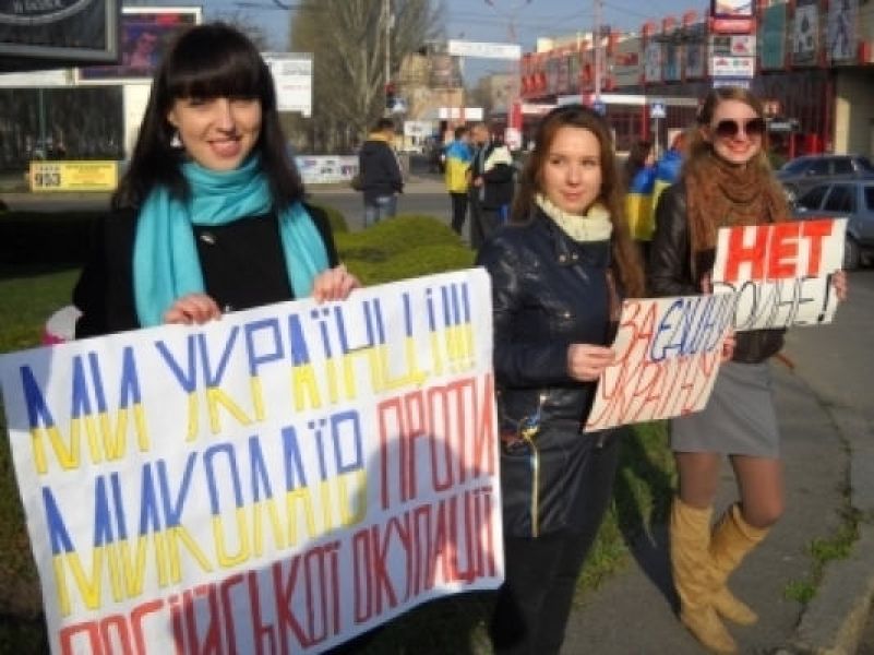 В руках активисты держали плакаты: «Доброе утро, Николаев. Мы за мир», «Мы украинцы!!! Николаев против российской оккупации», «За единую Украину», «Нет войне!» и прочие.