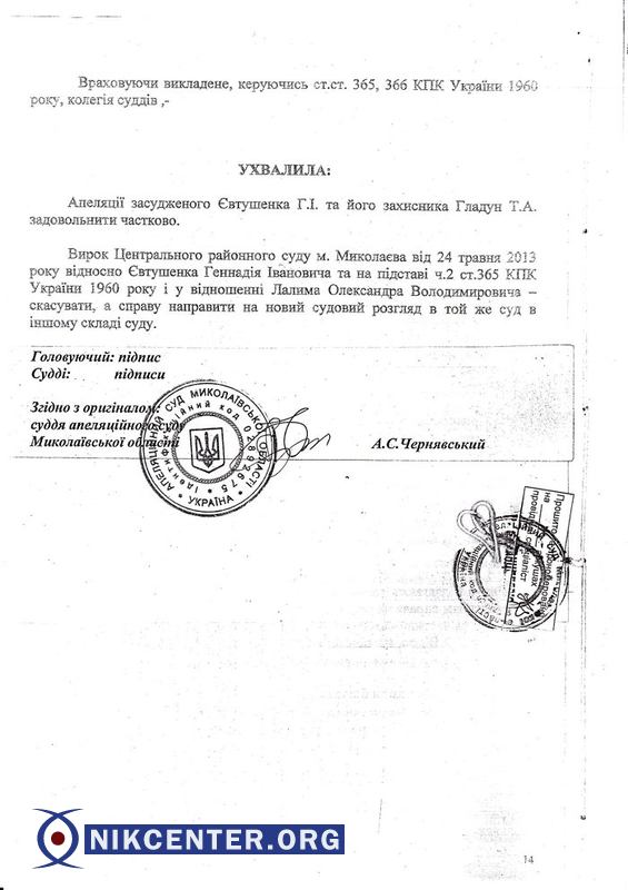 Апелляционный суд Николаевской области после трёх месяцев рассмотрения принял по-своему беспрецедентное решение. Коллегия судей в составе Александра Ржепецкого, Ивана Хомика и Анатолия Чернявского отменила приговор, который 23 мая 2013 года вынес судья Центрального районного суда Николаева Владимир Галагуза.
