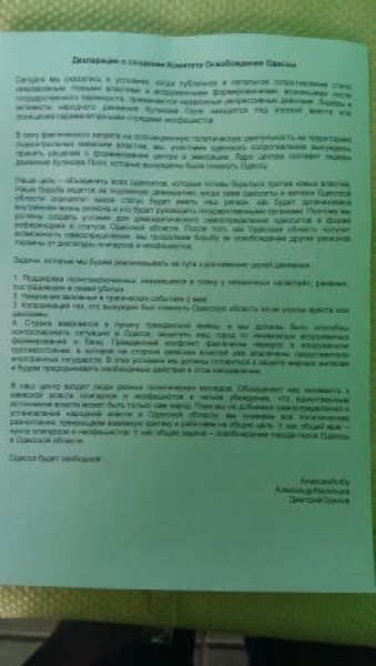 В декларации сказано, что участники Комитета ведут борьбу «за подлинную демократию» и хотят создать условия «для демократического самоопределения одесситов в форме референдума о статусе Одесской области». Кроме того, «освободители» Одессы обещают, что после того, как наш регион получит возможность самоопределения, они продолжат борьбу за освобождение других регионов Украины «от диктатуры олигархов и неофашистов».