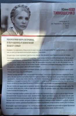 Такие письма, в частности, получили жители Приморского района Одессы, Саратского, Измаильского районов области и райцентра Белгород-Днестровский. Кандидат пишет об агрессии со стороны России, рассуждает о бизнес-интересах соперников по предвыборной гонке, кратко излагает свою программу и, конечно, призывает проголосовать за нее. Примечательно, что письма начинаются не стандартной фразой «Дорогие одесситы..» или «Уважаемые избиратели…», а обращением к конкретному человеку, проживающему по конкретному адресу.