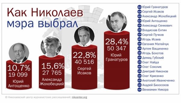 По итогам подсчета голосов, мэром города николаевцы выбрали секретаря горсовета Юрия Гранатурова — у него 50 347 голосов. Его главный конкурент Сергей Исаков отстал почти на 10 тысяч голосов, набрав 40 516 голосов.