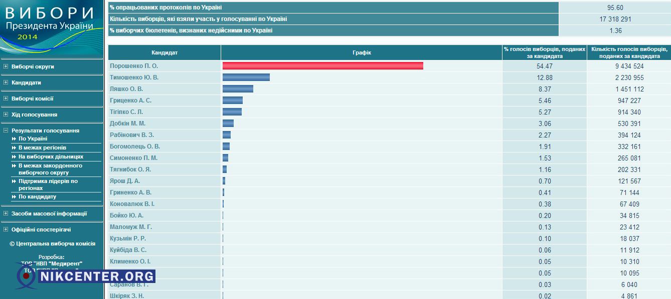 Согласно данным обработки 95,6% протоколов в электронном виде за Петра Порошенко проголосовали 54,47% избирателей.