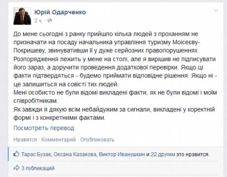 «До мене сьогодні з ранку прийшло кілька людей з проханням не призначати на посаду начальника управління туризму Моісеєву-Покришеву, звинувативши її у дуже серйозних правопорушеннях. Розпорядження лежить у мене на столі, але я вирішив не підписувати його зараз, а доручити проведення додаткової перевірки. Якщо ці факти підтвердяться — будемо приймати відповідне рішення. Якщо ні — це залишиться на совісті тих людей».