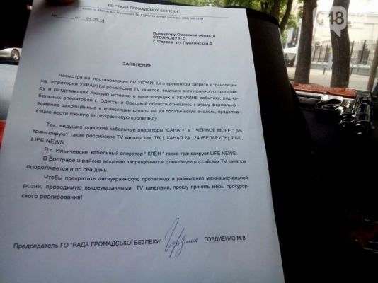 Сегодня утром активисты одесского Евромайдана обратились к прокурору Одесской области Николаю Стоянову с просьбой принять меры прокурорского реагирования к операторам кабельных сетей, которые, несмотря на предписания Нацкомитета по вопросам телевидения и радиовещания — продолжают ретранслировать российскую пропаганду, — сообщает 048.ua.
