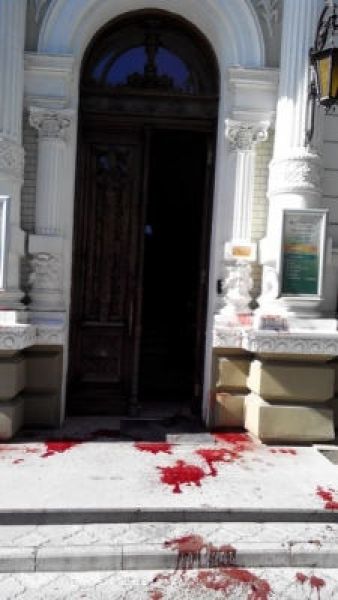 Сейчас активисты решили пойти еще дальше и выразить свою позицию непосредственно на фасаде здания. Так, утром они облили вход в здание, ступеньки и парапет зеленкой и свиной кровью, забросали здание яйцами. По информации очевидцев, охраны и правоохранителей во время "акции" на месте не было. Фото – из соцсети ВКонтакте.